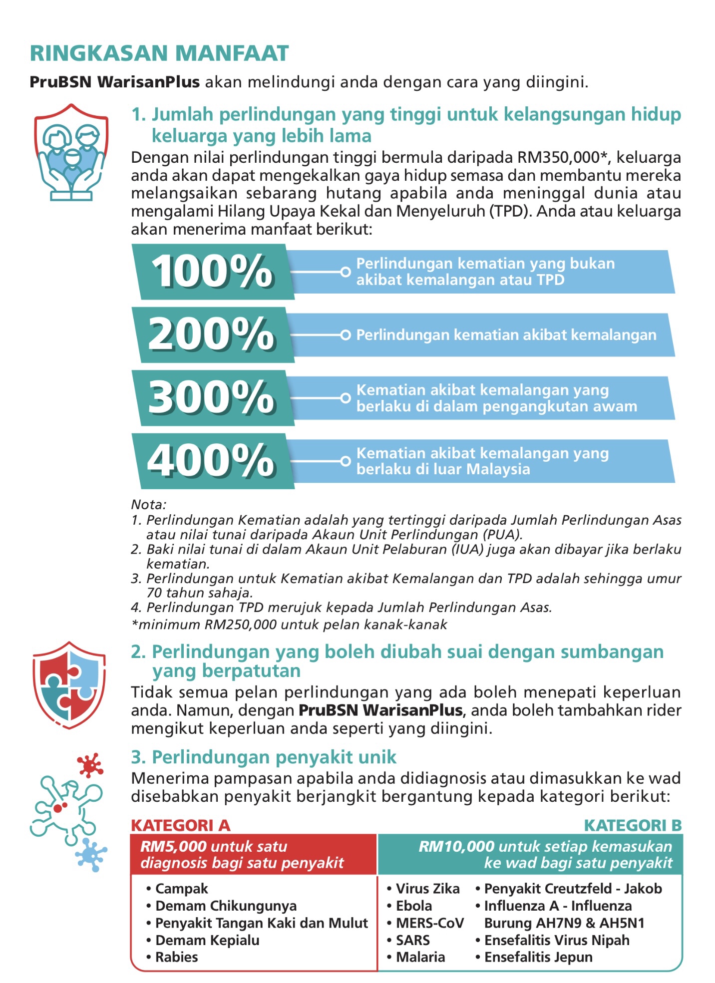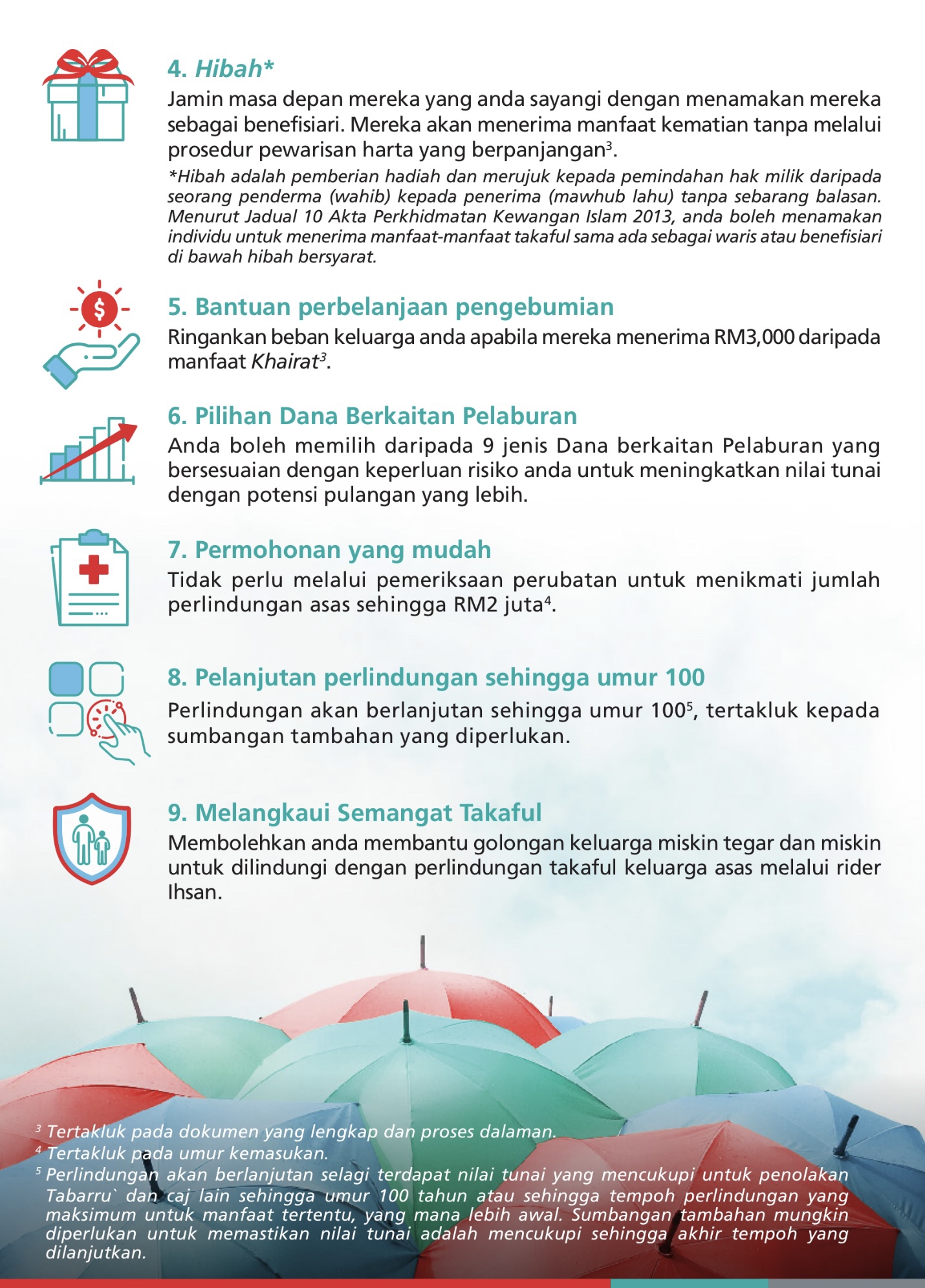 3. Manfaat ini juga tidak melalui pembahagian faraid kerana Hibah dari sijil Takaful terkeluar dari pentadbiran pusaka. Gunakan peluang ini sebagai aset segera yang boleh diberikan pada isteri tercinta. Bolehlah mereka gunakan wang ini demi kelansungan hidup nanti.