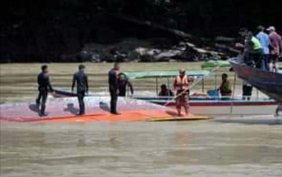 Selepas hampir empat jam menyusuri arus deras Sungai Rajang, kami sampai di lokasi dan pandangan pertama tertumpu kepada bot yang terbalik di tengah sungai.