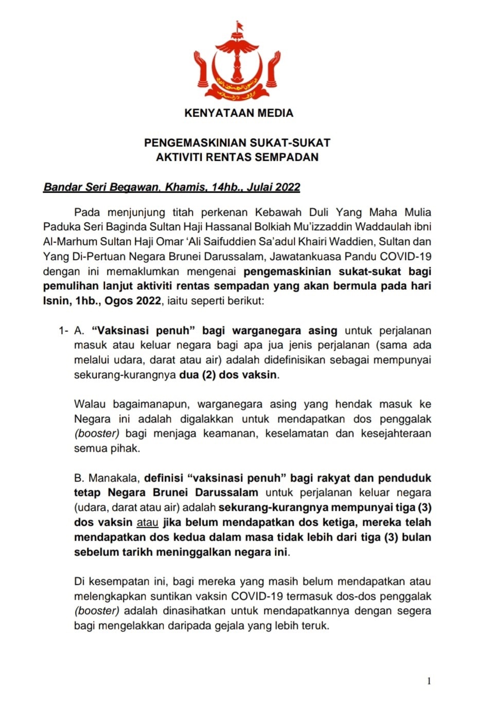 pemulihan lanjut aktiviti rentas sempadan yang akan bermula pada hari Isnin, 1hb., Ogos 2022, iaitu seperti berikut: