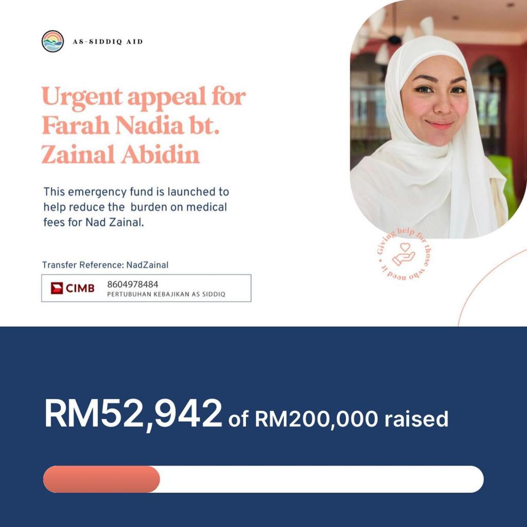 Ramai sudah maklum mengenai pelakon Nad Zainal yang masih dirawat di wad ICU sejak minggu lalu.Tabung Kecemasan ini adalah insiatif rakan rakan serta peminat Nad Zainal bagi menampung kos rawatan medikalnya di hospital pakar untuk membantu meringankan beban keluarganya. Bagi semua yang prihatin, mari kita sama sama berganding bahu untuk bantu bersama.Yang pastinya, jangan kita lupa titipkan doa untuk Nad Zainal agar kembali pulih sepenuhnya dan jangan lupa juga untuk kongsikan post ini agar lebih ramai dapat turut membantu.*Kepada sesiapa yang menggunakan CDM, boleh email kami resit: info@assiddiqaid.com