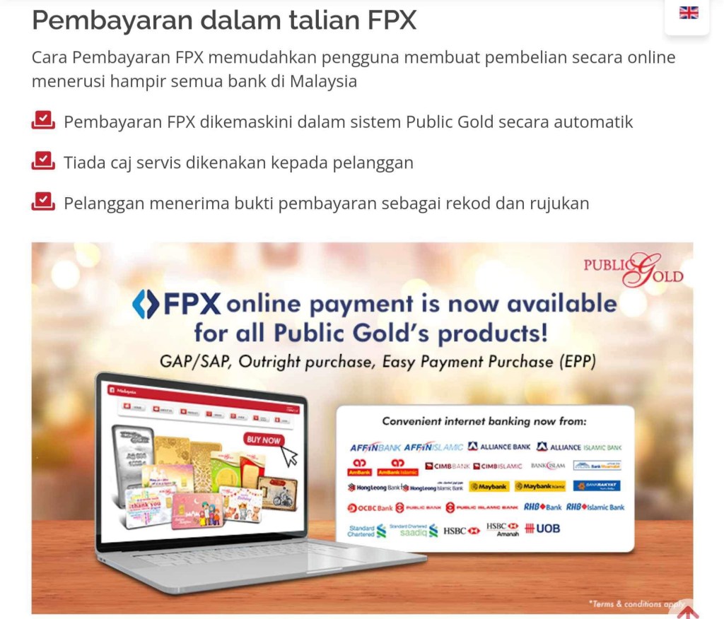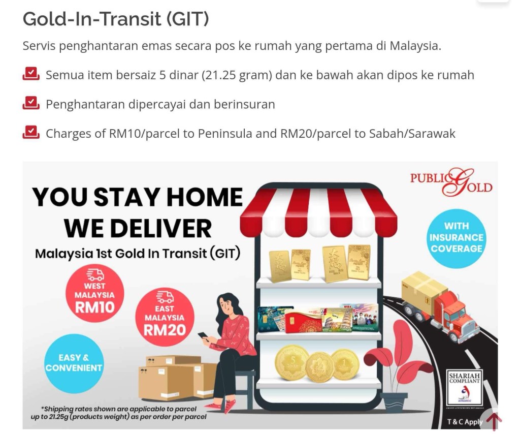 Disamping itu juga terdapat banyak kemudahan menyimpan di Public Gold.Antara nya ialah Gold In Transit (GIT), Pembayaran FPX dan Patuh Syariah.